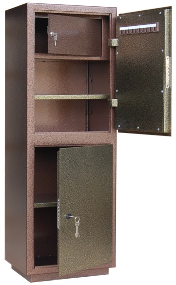 Сейф двухсекционный, оснащен двумя съемными полками и Трейзером. В двери установлен ключевой 8-ми сувальдный замок ЗАО "Про-Сам" г. Рязань или аналогичный замок другого производителя.